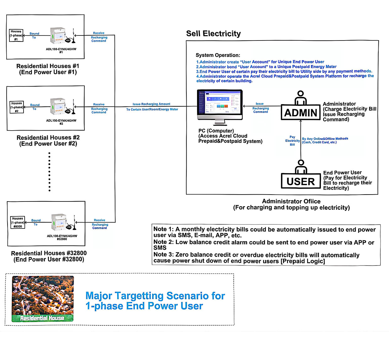 Сквозная система предоплаты/постоплаты Acrel специально создана для школьных общежитий, торговых центров, промышленных парков и жилых комплексов. Трехуровневая архитектура начинается с интеллектуальных счетчиков ADL100-EY (однофазный) и ADL300-EY (трехфазный); каждый из них оснащен реле с магнитной фиксацией на 100 А, поддерживает DL/T 645 и Modbus-RTU и записывает кВтч с точностью класса 1.